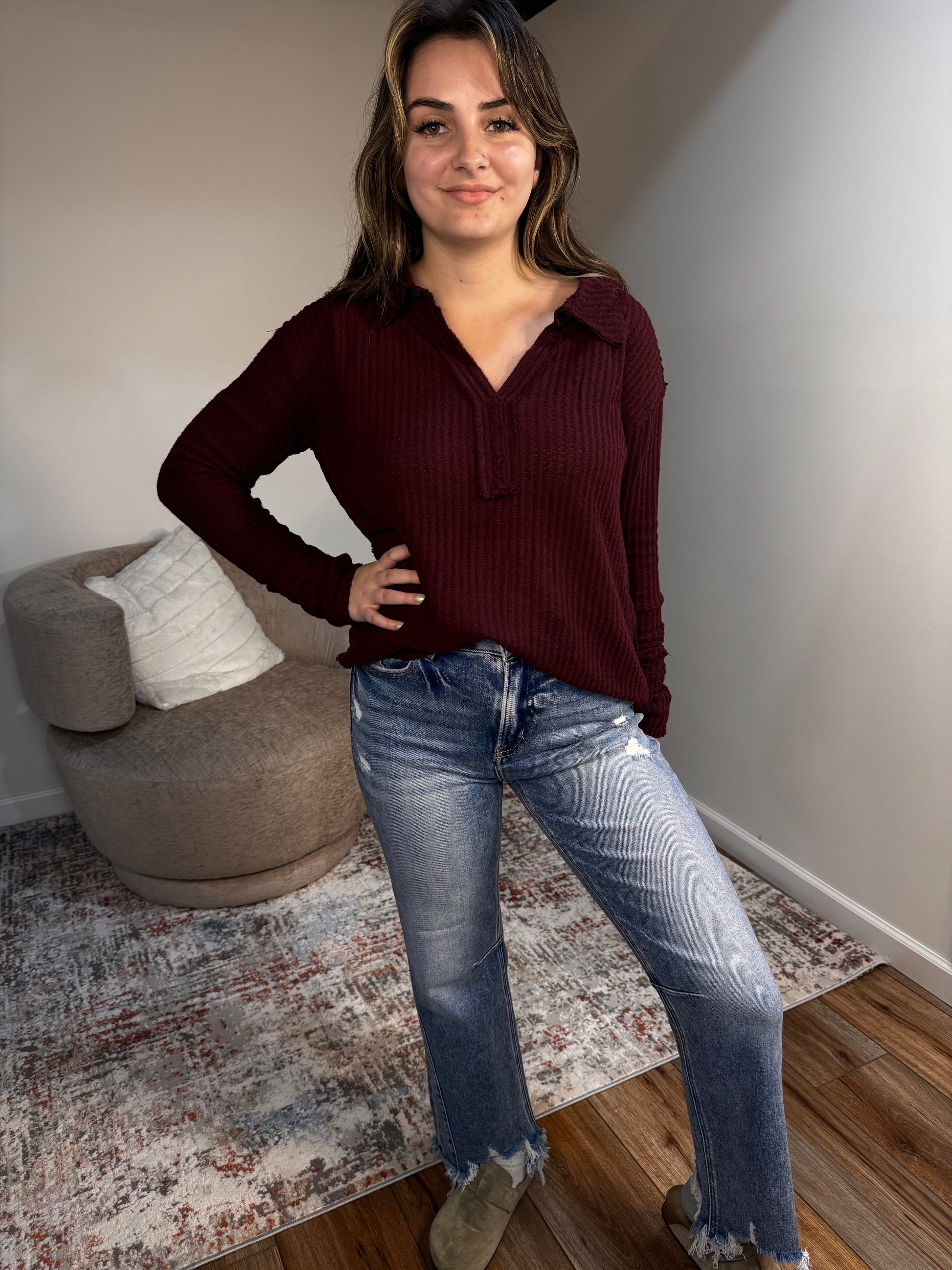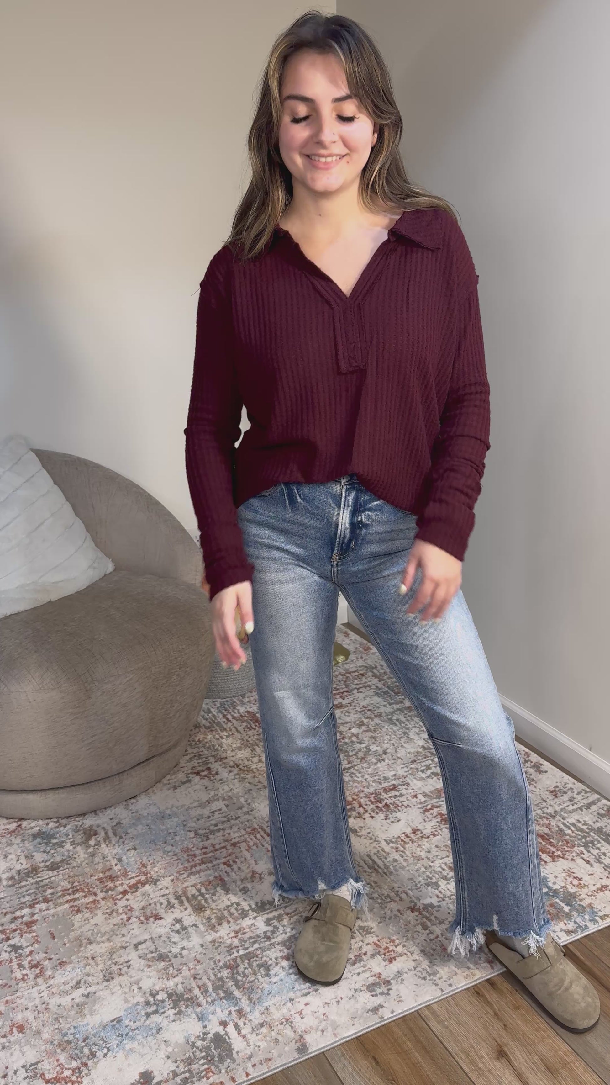 Made for cozy comfort, this super soft knit top features a brushed waffle fabric that feels as good as it looks. Designed with a relaxed fit and thoughtful details like a v-neckline with collar, raw edge seams, and a curved U-shaped hem, this top blends laid-back style with everyday wearability. Long sleeves with thumb holes add a functional, casual touch, making it perfect for layering or lounging.