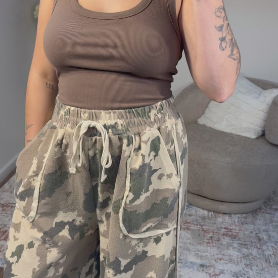 The Kasey Camo Print Washed Terry Knit Pants bring a relaxed, utility-inspired vibe to everyday comfort. Made from soft terry with a mineral-washed finish, these pants have a worn-in feel that’s casual and effortless. Designed with a wide leg silhouette and raw edge gauze accents, they feature large patch pockets and a drawstring elastic waistband for an adjustable fit. Perfect for laid-back days or styled with a simple tee, they’re a statement alternative to your everyday joggers.